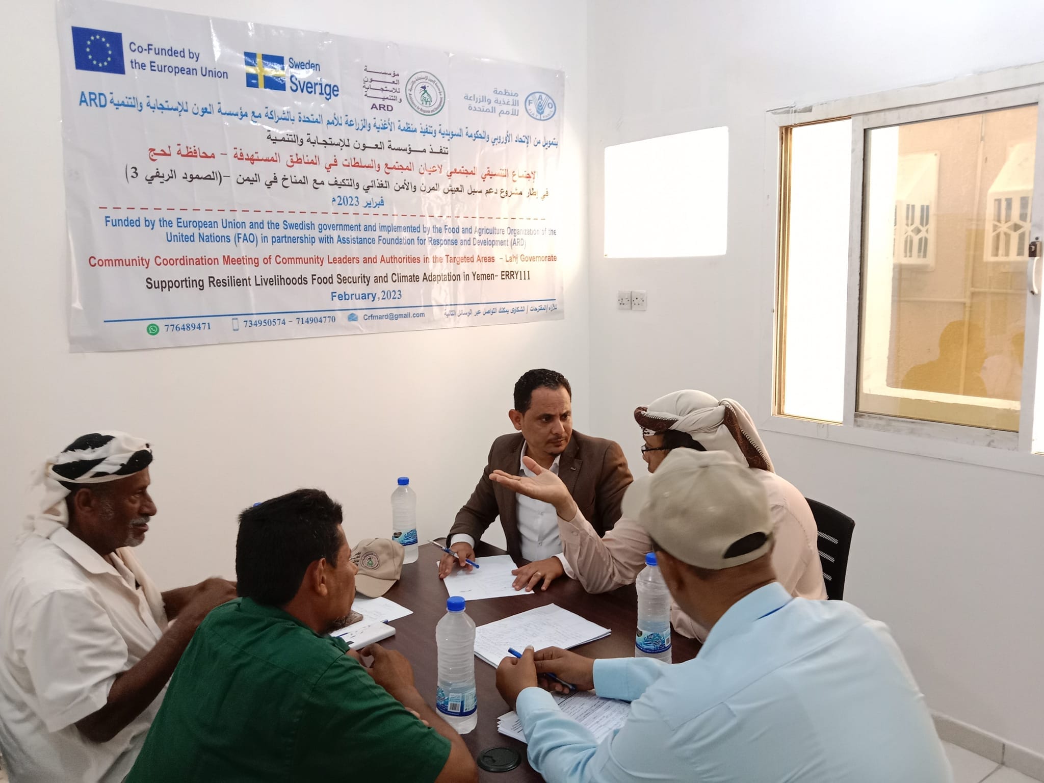 The coordination meetings included several relevant entities, represented by the Ministry of Agriculture, Irrigation and Production Sector, the Governor of Lahj, the Director General of Agriculture in Lahj Governorate, the Directors General of the targeted districts of Tuban, Al-Mudharaba, Ras Al-Ara, and Al-Maqatra, and the Directors of Agriculture in the targeted districts.