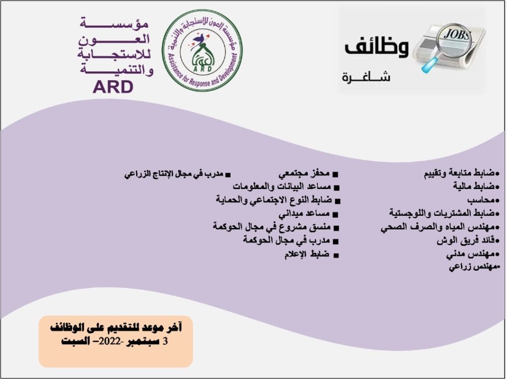 وظائف شاغرة لدى مؤسسة العون للاستجابة والتنمية ARD اخبار تعلن […] وظائف شاغرة لدى مؤسسة العون للاستجابة والتنمية ARD Read More »